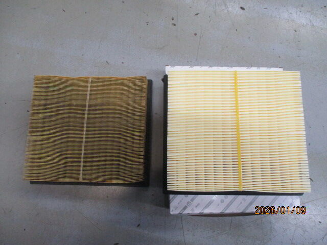右の新品のエアーフィルターと比べてみると汚れ具合が分かりやすいと思います。